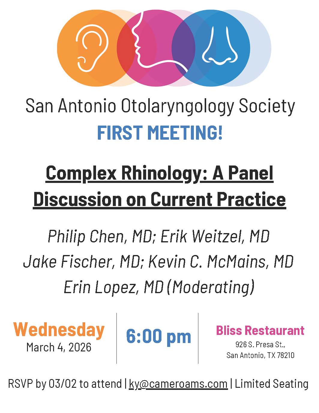 San Antonio Otolaryngology Society (SAOS)The purpose of the San Antonio Otolaryngology Society (SAOS) is to improve patient care by advancing scientific knowledge in the field of Otolaryngology - Head and Neck Surgery and to promote good fellowship among members of the society. SAOS was founded on June 1, 2025 as a non-profit organization in response to the need to increase communication and foster camaraderie among surgeons practicing otolaryngology in San Antonio as well as provide continuing education. Board Members